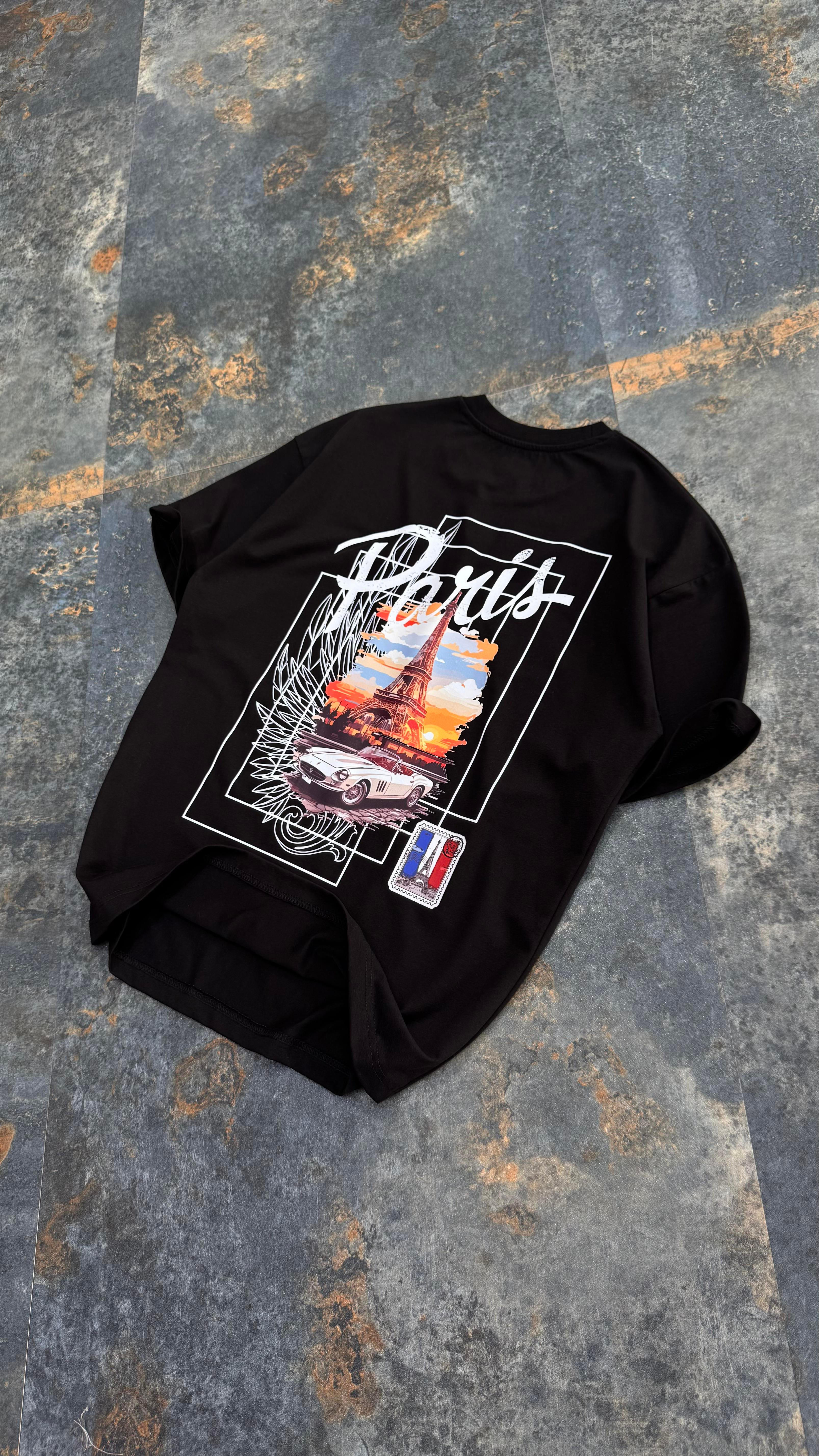 Paris Baskılı Siyah Oversize T-Shirt