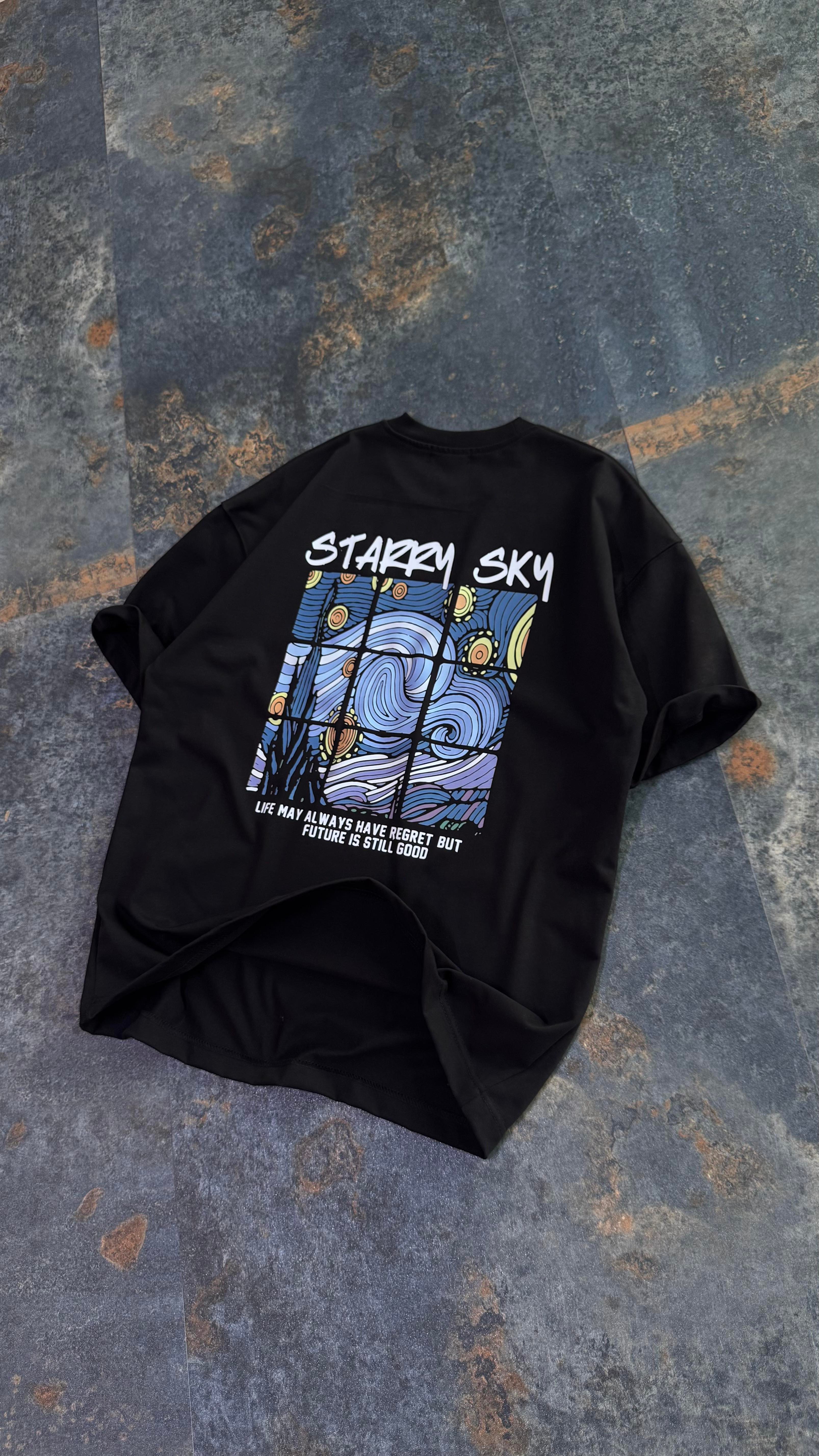 Starry Sky Baskılı Siyah Oversize T-Shirt